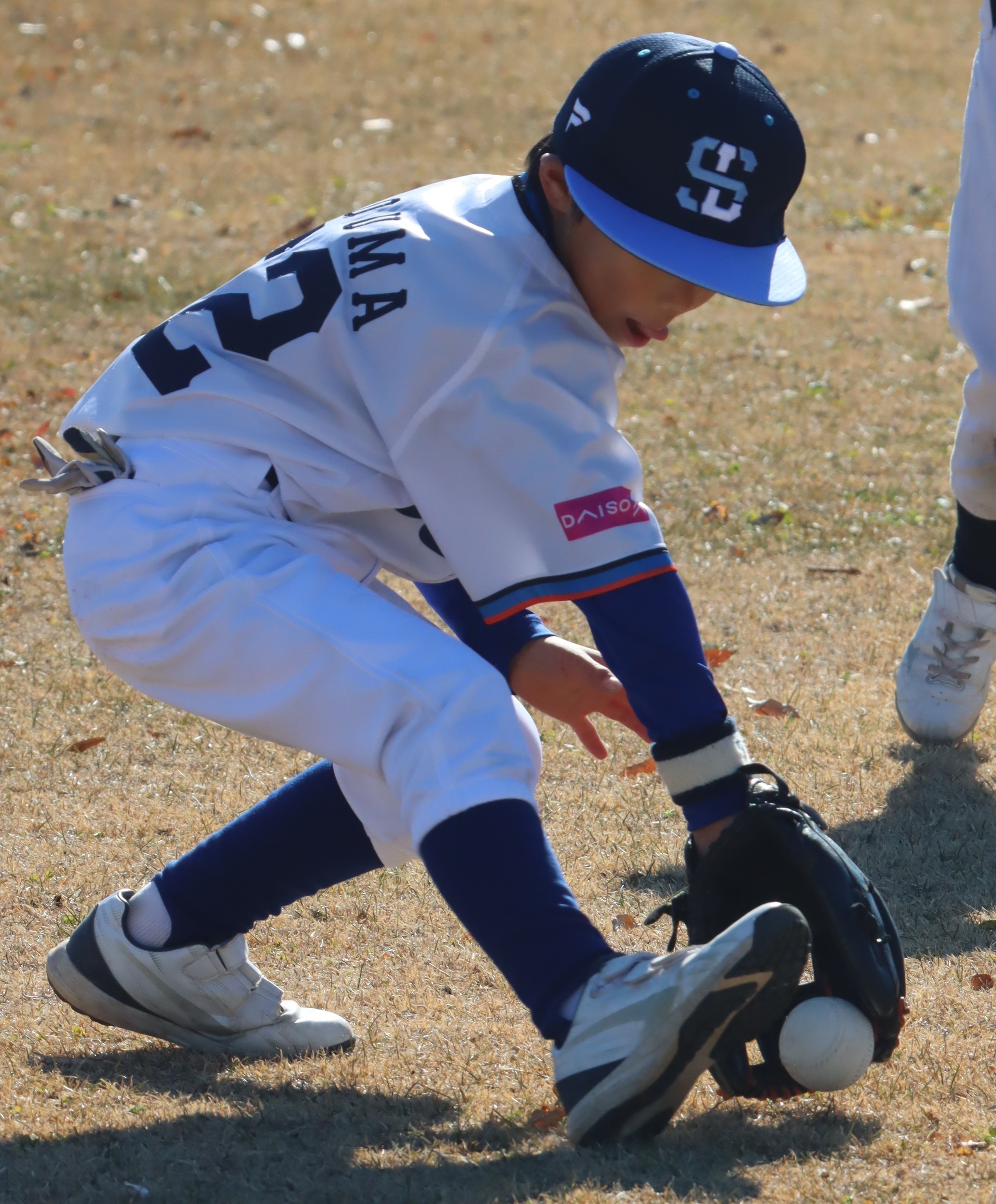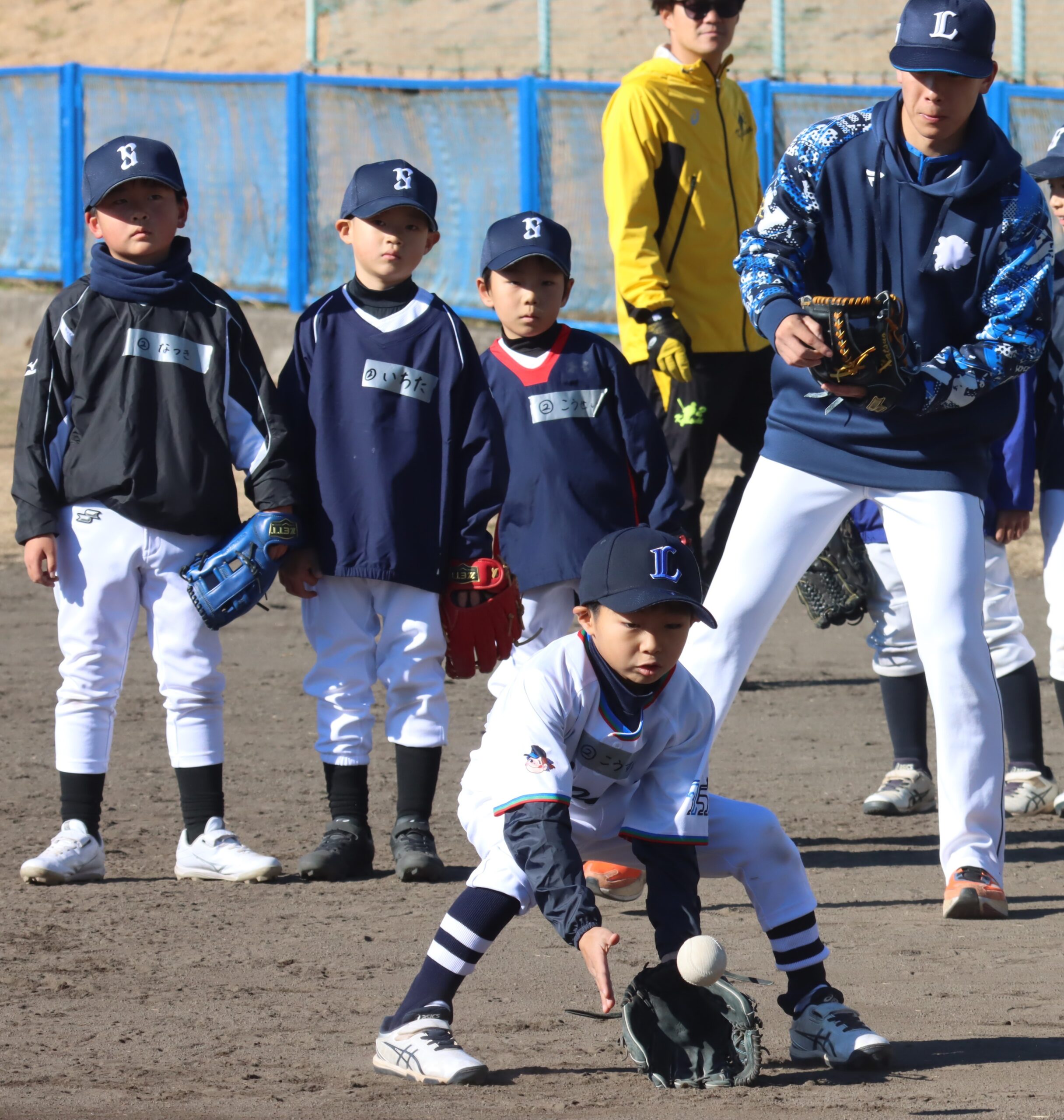ユニホーム姿で集結した球児たちはまず午前9時半から鬼ごっこで体をほぐした。続いて内野守備、外野守備、打撃、投球の4グループに分かれて約2時間にわたって穏やかな日差しを受けながら元気いっぱいに白球を追いかけた。滝澤内野手は内野守備を担当し自らノックを受けて手本を示し、藤澤さんは投球を担当しボールの握りから丁寧に説明した。最後は、滝澤内野手が内野ノックのデモンストレーションを行って4年目の今季1軍でキャリアハイの125試合に出場したプロの技を披露。日本球界屈指の軽やかな捕球と素早く正確な送球に保護者からも歓声が上がった。