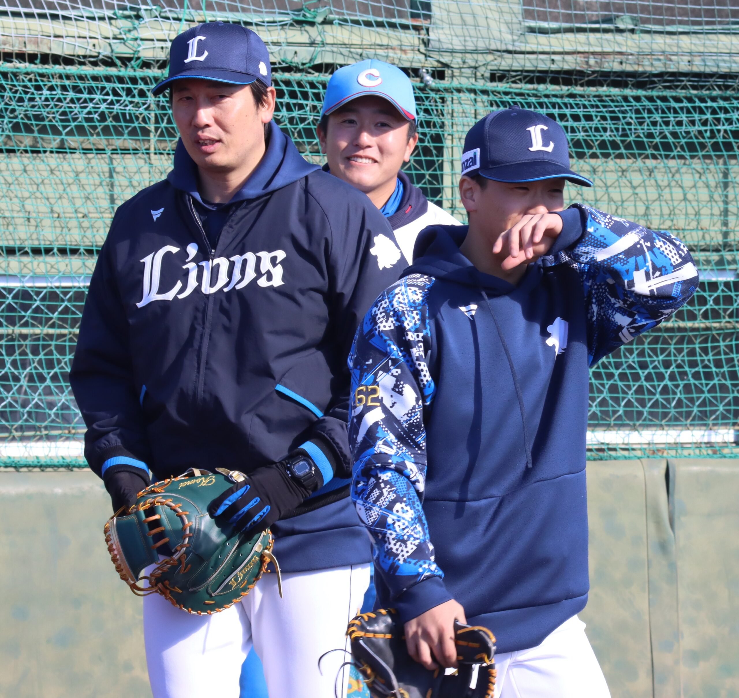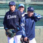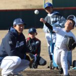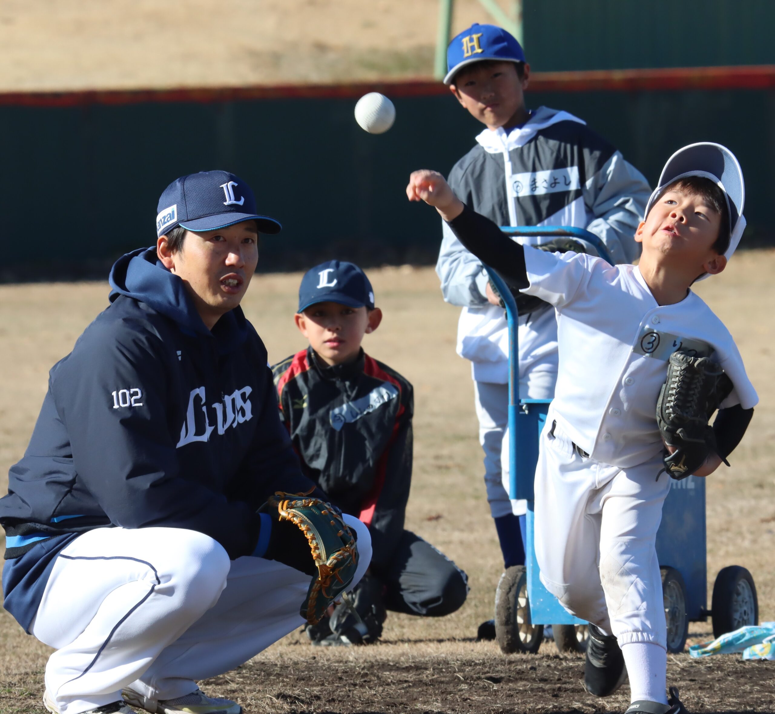 第12回アカハネ保険事務所お客様感謝デー「現役野球選手に教わる野球教室」が7日、佐久市営球場で行われ、佐久市と小諸市の小学生約50人が埼玉西武ライオンズの滝澤夏央内野手と上田市出身の同球団職員・藤澤亨明さんから指導を受けた。