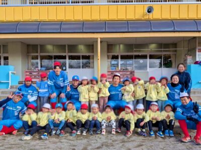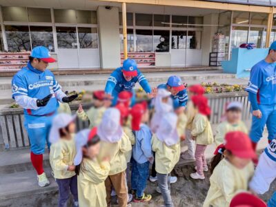 続いて、年中クラス(2クラス)の園児の皆さんとティーボール教室を実施しました。